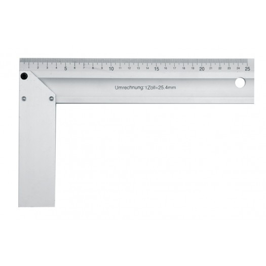 Edzett alumíniumból készült derékszög lábbal, fekete milliméteres skálával.