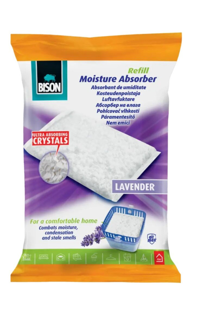 A BISON Páramentesítő Utántöltő Tasak Levendula, 450g-os kiszerelésben hatékony és egyszerű megoldást kínál a zárt terek túlzott páratartalmának szabályozására. Segít megelőzni a penészképződést, a dohos szagokat és a nedvesség okozta károkat, miközben kellemes levendulaillatot áraszt a helyiségben. A termék ideális választás lehet otthonokba, pincékbe, gardróbokba vagy akár lakókocsikba is.