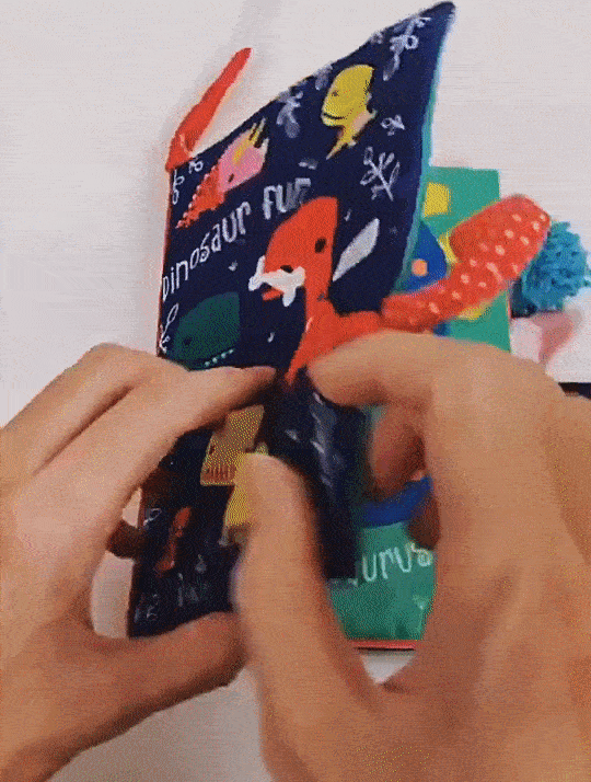 Ez a baba textilkönyv egy élénk színű, kedves mini könyv, melynek minden lapja szövet borítású, illetve zörgős papírral tömött.