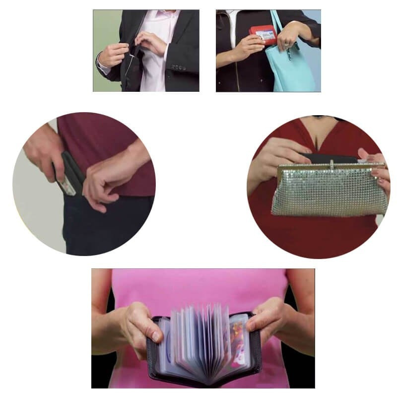 36 db bankkártya és más különböző irat tárolására alkalmas, ráadásul található benne két rekesz, ahol papír pénzt, egyéb iratainkat tárolhatjuk. A külső borítás és a belső burkolat közé helyezett fémes anyag blokkolja az RFID visszaélést, véd az érintésmentes fizetési lehetőségekkel való visszaélések ellen.