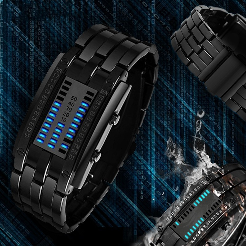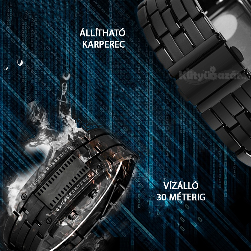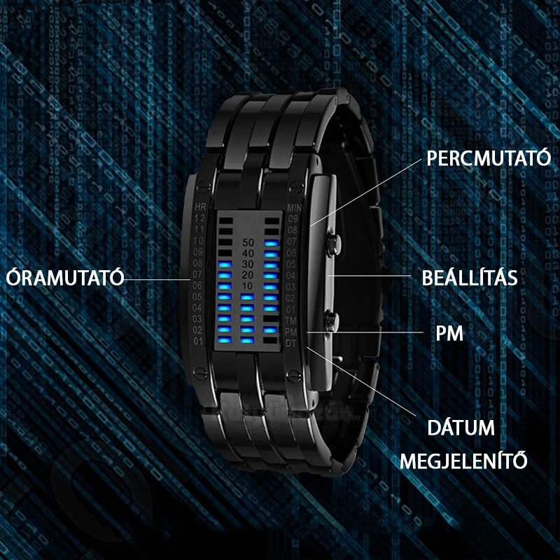 Ebben a bináris órában meg fogod találni. Különlegessége abban rejlik, hogy nem a megszokott módon mutatja az időt, ugyanis értened kell hozzá, hogyan olvasd le. De ne aggódj, nagyon egyszerű! Ismerőseid is nagyon vagánynak fogják tartani, hiszen elegáns, exkluzívan mutat a kezeden, led csíkjai pedig szinte futurisztikusan hatnak!