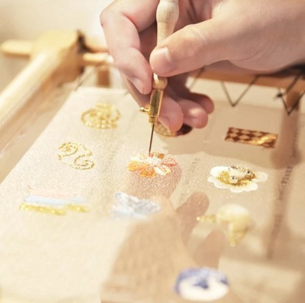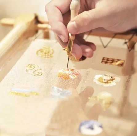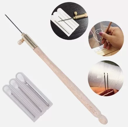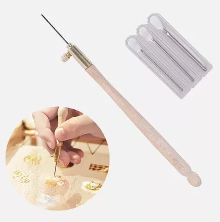 3 db különböző méretű hímzőtűt és egy fanyelű hímzőtű aljat, amiben cserélgethetőek a kapott tűk.