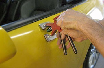 Ezt követően csatlakoztasd a kihúzó szerszámot a felragasztott koronghoz, majd finom mozdulatokkal, fel-le irányuló mozgással kezdd el húzogatni a szerszám karját. Ezzel megkezdődik a behorpadt rész visszaalakítása. Ezt addig folytasd, míg a ragasztó elenged. Az esetek nagy részében a ragasztó a kasznitól válik el, de van, hogy a kihúzófejet engedi el. Bármelyik eset is álljon elő, távolítsd el a ragasztómaradékot. A maradék ragasztó eltávolítását alkohollal átitított kendővel érdemes végezni.