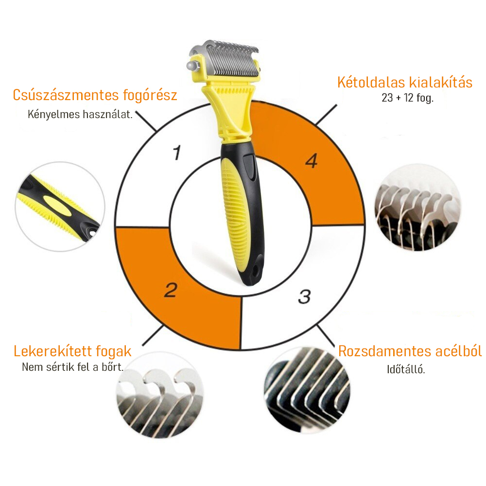 A kefe kétoldalas kialakítású. Egyik oldalán 23 darab, míg a másik oldalán 12 darab rozsdamentes acélból készült fog található. A ritkábban rakott fogak a nagyobb csomók eltávolítására használhatóak, míg a másik oldal a gyorsabb eredményhez és a teljes átfésüléshez ideális. A fogak vége lekerekített, így a kütyü alkalmazása során nem sértik fel kis kedvenced bőrét, sőt inkább masszírozó hatást keltenek.