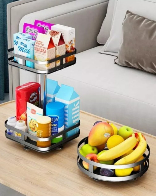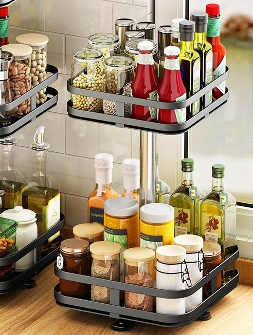A kétszintes konyhai fűszertartó állvány különlegessége, hogy 360°-ban forgatható és a szintek közötti különbség állítható. Ezáltal még praktikusabb, mivel az igényeid szerint tudod beállítani a megfelelő méretet. Tárolhatsz benne fűszereket, olajat, mustárt, kekszet és bármit, ami a sütés-főzés során szükséges.
