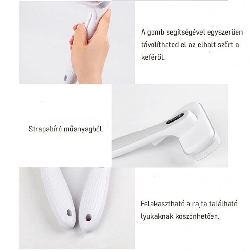Fésülés után az elhalt szőr eltávolítása a készülékből rendkívül egyszerű. A fogórészen található gombot kell csak megnyomni, ezáltal behúzódnak a fogak és egyetlen mozdulattal, egyben leszedhetővé válik az összegyűjtött szőr és egyéb szennyeződés.