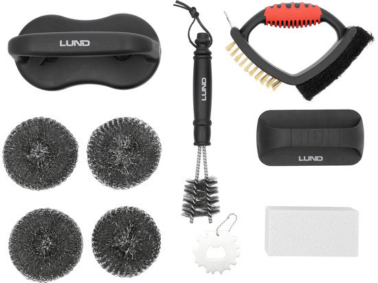 A grilltisztító készlet tartós keféket tartalmaz, amelyek lehetővé teszik az odaégett ételmaradékok, zsír vagy faszén alapos eltávolítását a grillek, rostélyok, füstölőkamrák és hamutartók felületeiről.
