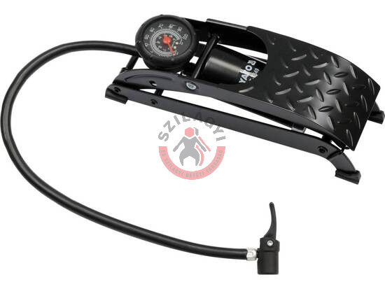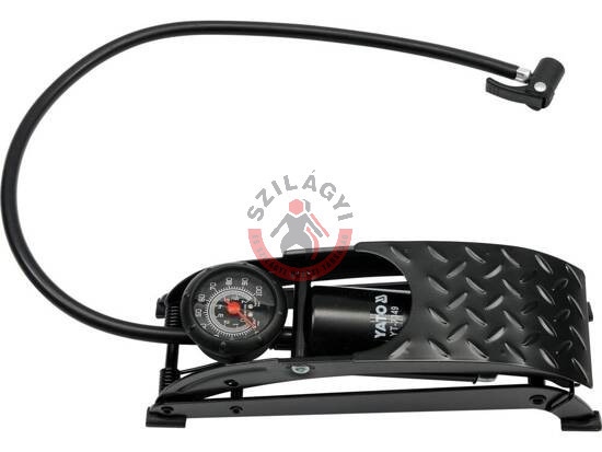 Egytengelyes lábpumpa szilárd építéssel, 3 mm vastagságú préselt, lakkozott acéllemezből. Nyomásmérő legfeljebb 7 bar terheléssel.