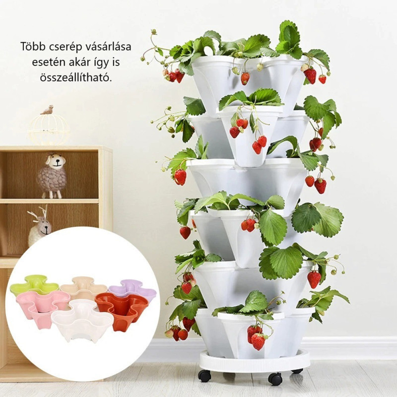 Ez az innovatív cserép lehetővé teszi a különböző növények termesztését, beleértve az epret, gyógynövényeket, paradicsomot, paprikát és még sok mást. A cserép különleges kialakításának köszönhetően speciális vízáramlás történik locsolás közben. Ez a kialakítás megkönnyíti a növények öntözését és gondozását. Több termék vásárlása esetén az cserepek egymásba illeszthetők.