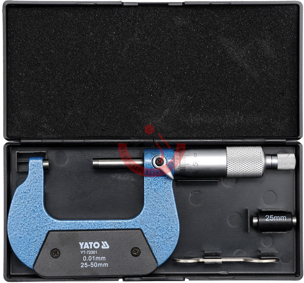 YATO professzionális mechanikus mikrométer az igazán pontos mérésekhez. Mérésnél először a rögzítő kart oldja fel. A mérendő tárgyat fogja körbe a pofákkal, majd szorítsa rá őket. Mérési eredmény elolvasása előtt rögzítő kart el kell fordítani. A nagyobb pontosság érdekébe ismételje meg, a kapott eredményeket pedig átlagolja. Használat előtt meg kell tisztítani a mérőfelületeket, pamut anyag ajánlott erre a célra. Tilos oldószeres vagy savas tisztítószert használni.