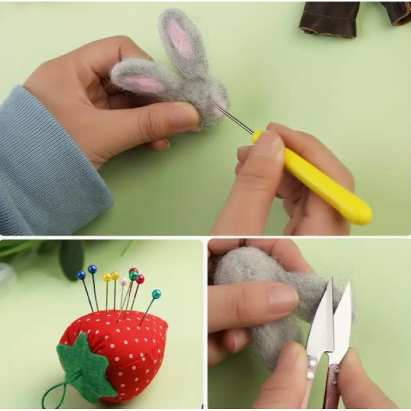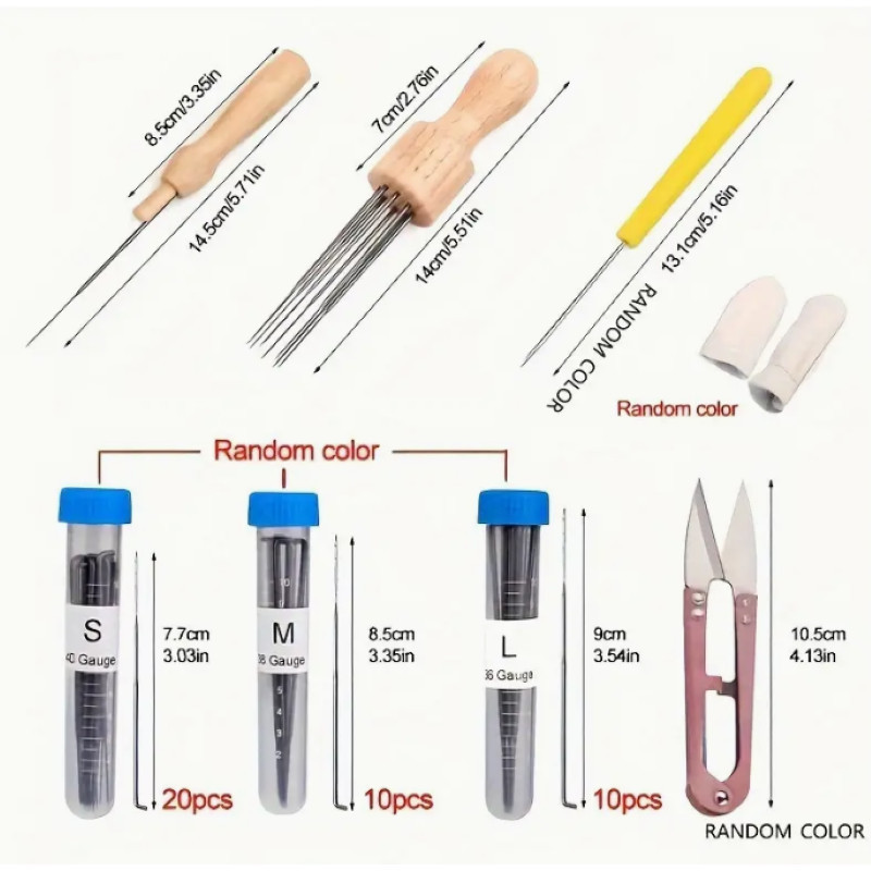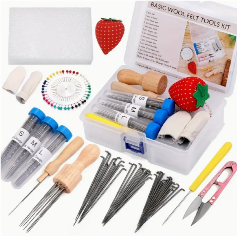 A készlet tartalma: 1 db ragasztórúd, 1 db műanyag doboz, 1 db olló, 40 db varrótű, 1 db fa tűtartó, 1 db akasztó lyuk készítéséhez, 1 db 8 tűs fa fogantyús szerszám, 1 db habszivacs a tű védelmére. 20 db nemezelő tű, 40 db gombos tű, 2 db bőr új védő