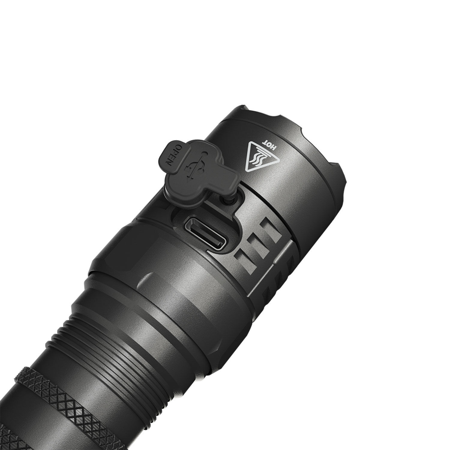 A lámpa áramforrásaként egy a csomag tartalmát képező NL2150HPi akkumulátor szolgál, mely 5000mAh kapacitású. A bele helyezett akkumulátort a lámpafej oldalán található USB-C port segítségével tudjuk tölteni, melyet egy gumírozott zárókupak fed el a külvilágtól, így meggátolva a víz és szennyeződések beszivárgását. A töltöttséget nyomon is tudjuk követni a töltőporttól balra található kis kék jelzőfényen, amely bizonyos számú villogással jelzi vissza az aktuális töltöttségi állapotot!