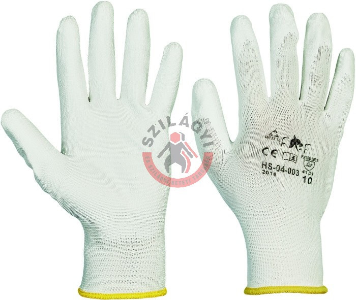 Kötött PES kesztyű PU mártott tenyérrel, rugalmas mandzsettával.
