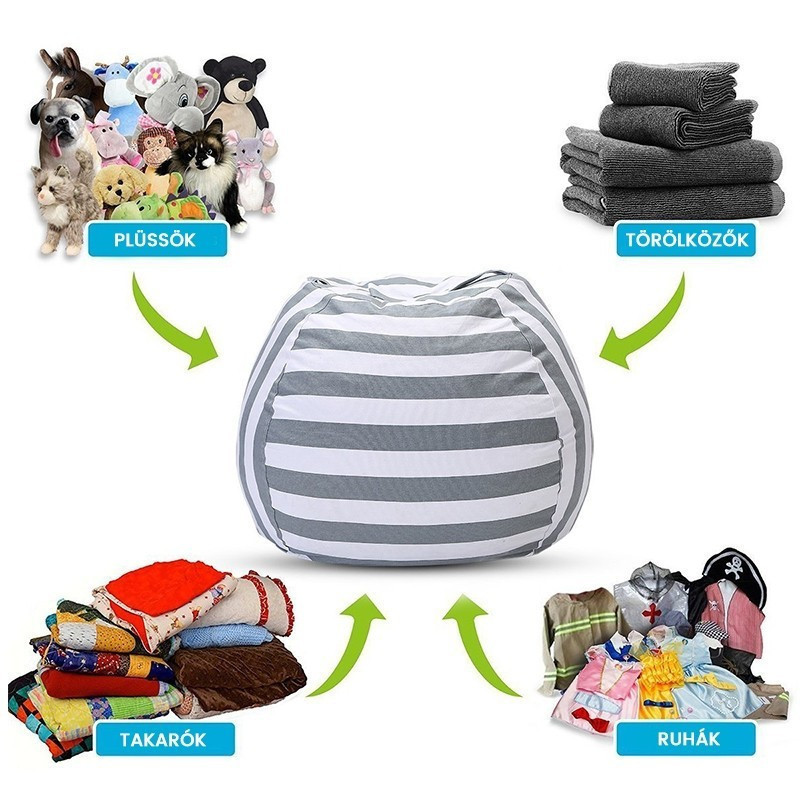 Kösd össze a kellemest a hasznossal! Tedd a plüssöket ebbe a tároló babzsákba, amibe elrejtheted a játékokat és gyerekfotelként is használhatjátok.