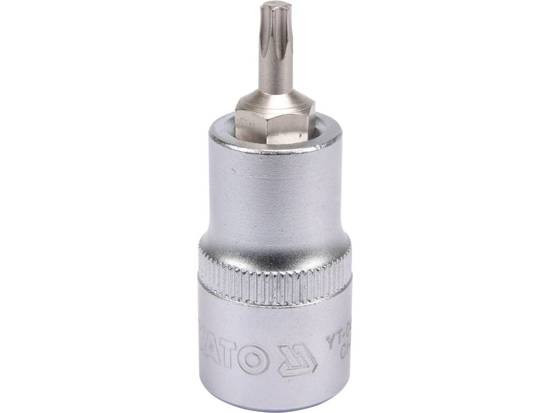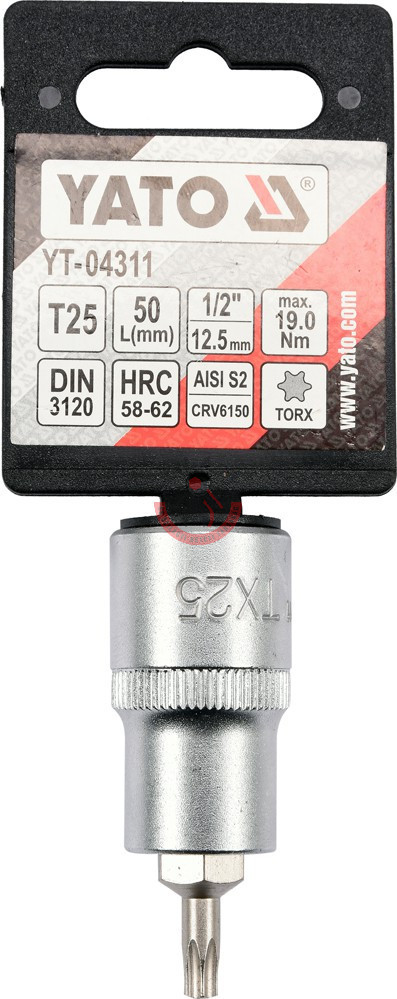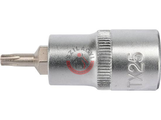 Professzionális TORX bithegy 1/2" meghajtású, T25-ös kihajtással, krómozott CrV6150 acél, AISI S2 acélból készült és nikkel bevonatú.