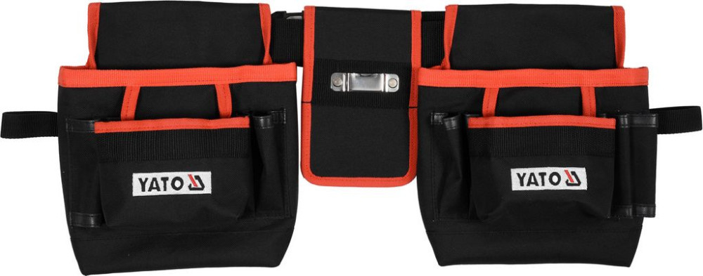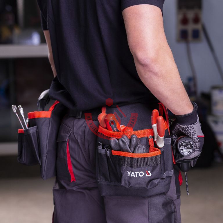 - 2 nagy, rögzített zsebbel, rekeszekkel a szerszámokhoz és egy fogantyúval egy csavarhúzóhoz vagy mérőszalaghoz