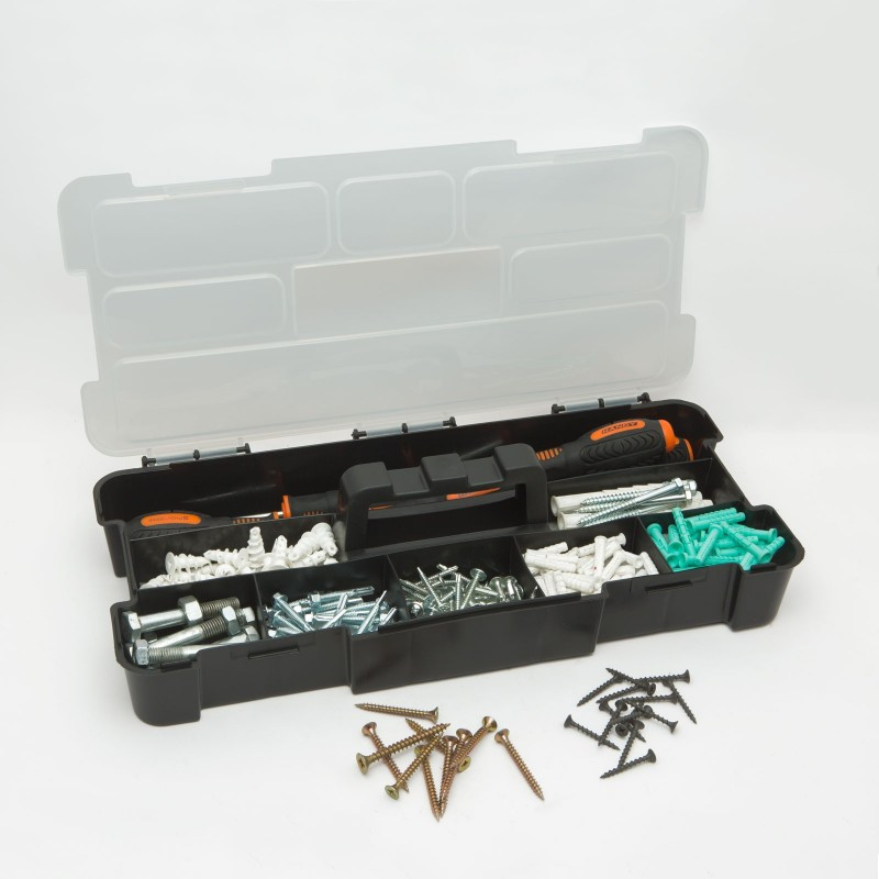 A termék 8 tálcával rendelkezik, amelyekben különböző méretű és funkciójú szerszámaidat helyezheted el egymást jól elkülönítve. A rekeszek háromféle méretben lettek kialakítva, amelyek közül 1 nagy, 2 közepes és 5 kicsi.