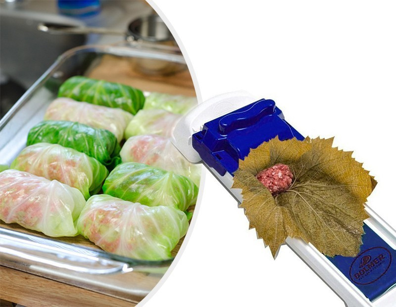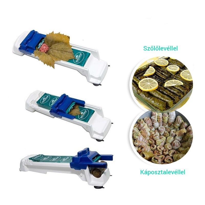 A töltött káposzta készítő géppel nem csak nagyon guszta kinézetű káposztákat készíthetsz, hanem fel is gyorsíthatod a főzés ezen folyamatát! Csak helyezd a káposzta, vagy szőlő levelet a gépre, tegyél rá egy kanál tölteléket, majd végül told előre a fogantyút ütközésig.