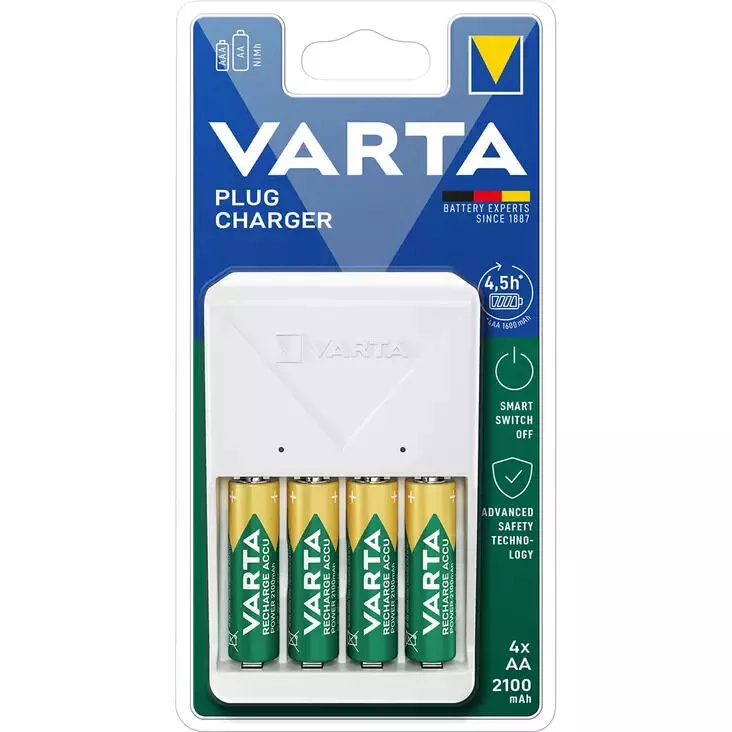 A VARTA Plug Charger egy egyszerűen használható, közvetlenül fali konnektorba dugható töltő, amelyhez most 4 darab AA méretű, 2100 mAh kapacitású R2U (Ready To Use) újratölthető NiMH akkumulátor tartozik. A készlet azonnal használatra kész, és ideális mindennapi háztartási eszközökhöz, játékokhoz, lámpákhoz, távirányítókhoz vagy bármilyen AA-t igénylő készülékhez.