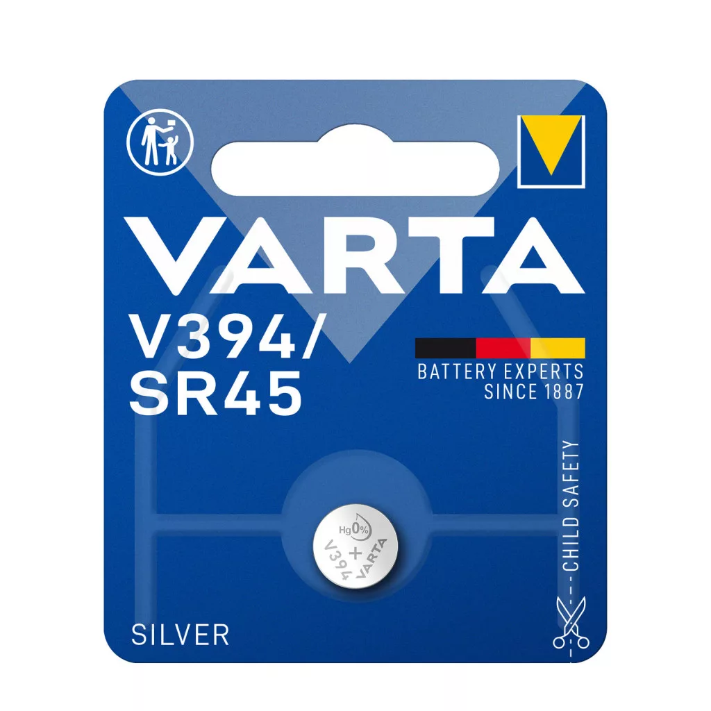 A Varta V394 gombelemezüst-oxid elektrokémiai rendszerrel működik. Megnövelt 1.55V névleges feszültséggel és 58mAh kapacitással rendelkezik. Ütésálló, valamint rázkódásálló, így épségét sokáig megőrzi! Használata igazánbiztonságos, hiszen magas szivárgásállóságjellemzi. Átmérője 9,5mm, magassága 3,6mm.